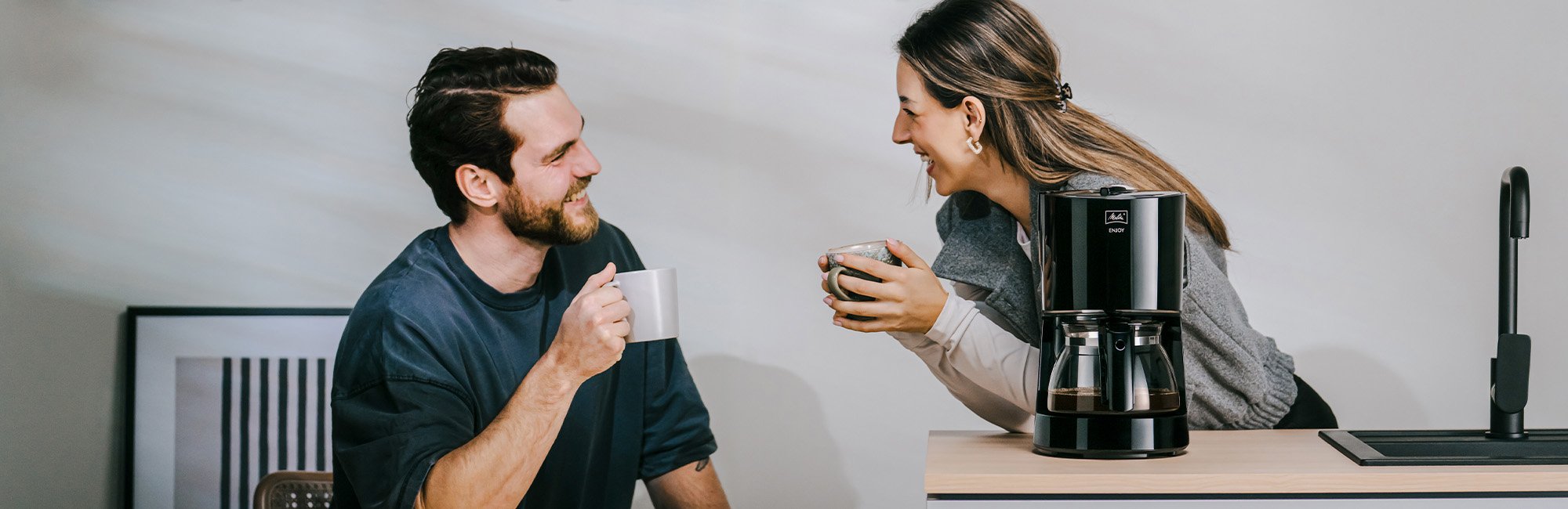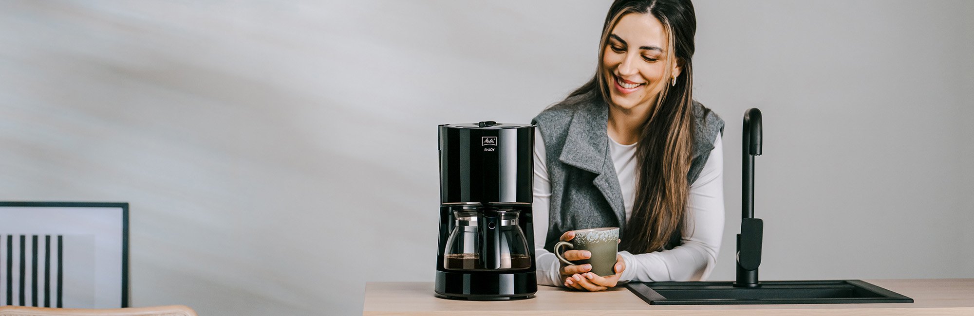 La cafetera de goteo Enjoy® II te permite personalizar tu café gracias a su función de selección de aroma, pudiendo regular la intensidad del café en cualquier momento. Además, cuenta con funciones que facilitan su uso, como la desconexión automática a los 40 minutos, bridando mayor seguridad en caso de que olvides apagarla.